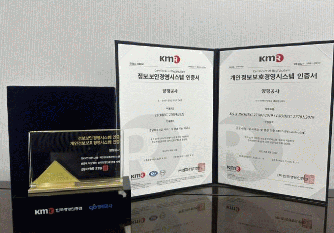 [NWS¹æ¼Û=Çѽ¸ñ ±âÀÚ]¾çÆò°ø»ç´Â Áö³­ 4¿ù 18ÀÏ Çѱ¹°æ¿µÀÎÁõ¿ø(KMR)À¸·ÎºÎÅÍ Á¤º¸ º¸¾È °æ¿µ½Ã½ºÅÛ ±¹Á¦Ç¥ÁØ ¡®ISO/IEC 27001¡¯°ú °³ÀÎÁ¤º¸º¸È£ °æ¿µ½Ã½ºÅÛ ±¹Á¦Ç¥ÁØ ¡®ISO/IEC 27701¡¯ ÀÎÁõÀ» µ¿½Ã¿¡ ȹµæÇß´Ù°í ¹àÇû´Ù. ¾çÆò°ø»ç´Â ¡¦