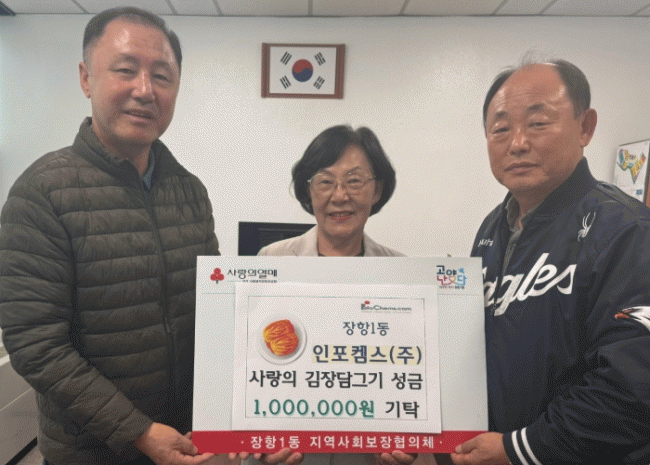 [NWS¹æ¼Û=Çѽ¸ñ ±âÀÚ]°í¾çƯ·Ê½Ã Àϻ굿±¸ ÀåÇ×1µ¿Àº Áö³­ 24ÀÏ È­ÇÐÁ¦Ç° ¼öÃâÀÔÀü¹®¾÷üÀÎ ¡®ÀÎÆ÷Äͽº(ÁÖ)¡¯·ÎºÎÅÍ »ç¶ûÀÇ ±èÀå´ã±×±â Çà»ç ÈÄ¿ø±Ý 100¸¸¿øÀ» Àü´Þ ¹Þ¾Ò´Ù°í ¹àÇû´Ù. ÀÎÆ÷Äͽº´Â Áö¿ª»çȸ ¹ßÀüÀ» À§ÇØ ÀåÇ×1µ¿¿¡ ²ÙÁØ¡¦