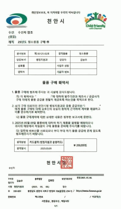 [»çȸ] õ¾È½Ã, °ø¹«¿ø »çĪ ¹°Ç°±¸¸Å »ç±â ¡®ÁÖÀÇ ´çºÎ¡¯ |2025. 05.14
