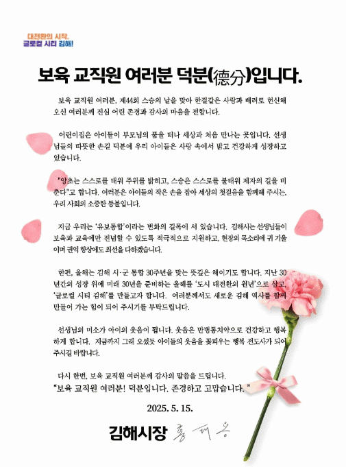[NWS¹æ¼Û=Çѽ¸ñ ±âÀÚ]±èÇØ½Ã´Â Á¦44ȸ ½º½ÂÀÇ ³¯À» ¸Â¾Æ ¾î¸°ÀÌÁý ±³»çµéÀÇ ³ë°í¿¡ °¨»çÇÏ´Â ¸¶À½À» ÀüÇϱâ À§ÇØ ½ÃÀå ¼­Çѹ®À» Àü´ÞÇß´Ù°í 14ÀÏ ¹àÇû´Ù. ¼­Çѹ®Àº ¡®º¸À°±³Á÷¿ø ¿©·¯ºÐ ´öºÐ(ÓìÝÂ)ÀÔ´Ï´Ù¡¯¶ó´Â Á¦¸ñÀ¸·Î ¾î·Á¿î º¸À°È¯¡¦