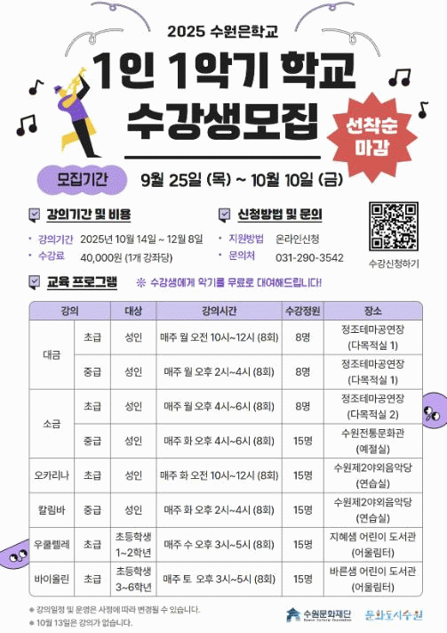 [»çȸ] ¼ö¿ø¹®È­Àç´Ü, ¾Ç±â ¹è¿öº¼±î? '1ÀÎ 1¾Ç±â Çб³' ¼ö°­»ý ¸ðÁý |2025. 09.26