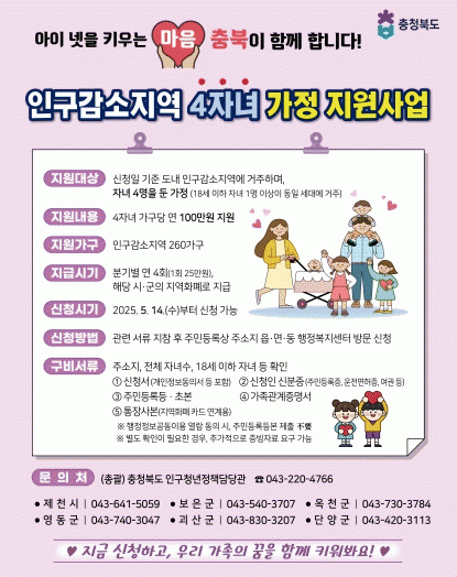 [»çȸ] ÃæºÏµµ, Àü±¹ ÃÖÃÊ Àα¸°¨¼ÒÁö¿ª 4ÀÚ³à °¡Á¤ Áö¿ø»ç¾÷ ½ÃÇà |2025. 05.14