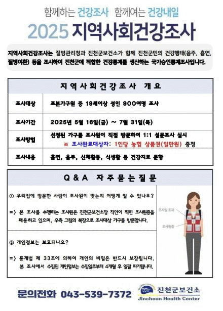 [NWS¹æ¼Û=Çѽ¸ñ ±âÀÚ]ÃæºÏ ÁøÃµ±ºÀº Áö¿ª»çȸ °Ç°­½ÇÅÂÁ¶»ç¿¡ µû¶ó ¸Å³â ½Ç½ÃµÇ´Â ¡®ÁøÃµ±º Áö¿ª»çȸ°Ç°­Á¶»ç¡¯¸¦ ¿À´Â 7¿ù 31ÀϱîÁö Ç¥º»°¡±¸¿ø Áß 19¼¼ ÀÌ»ó °ü³» °ÅÁÖ ¼ºÀÎÀ» ´ë»óÀ¸·Î ½ÃÇàÇÑ´Ù°í 14ÀÏ ¹àÇû´Ù. ÁøÃµ±º Áö¿ª»çȸ°Ç°­¡¦