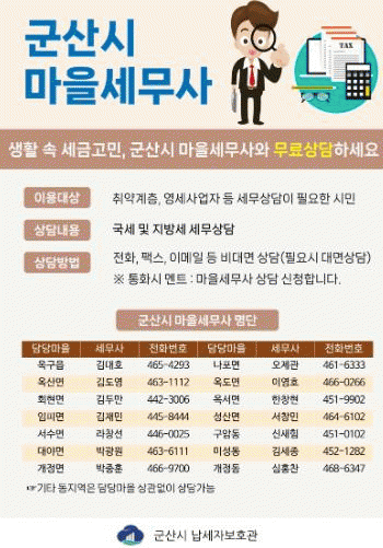 [NWS¹æ¼Û=Çѽ¸ñ ±âÀÚ]±º»ê½Ã°¡ ¹«·á ¼¼¹« »ó´ã ¼­ºñ½ºÀÎ ¡®¸¶À»¼¼¹«»ç¡¯¸¦ ¿î¿µÇÏ¸ç ½Ã¹ÎµéÀÇ ¼¼±Ý °í¹Î ÇØ¼Ò¿¡ ³ª¼­°í ÀÖ´Ù. ¡®¸¶À»¼¼¹«»ç¡¯´Â ¿µ¼¼»ç¾÷ÀÚ, ³ó¾îÃÌ ÁֹΠµî ¼¼¹«»ç ÀÌ¿ëÀÌ ¾î·Æ°Å³ª ³³¼¼ ºÒÆíÀ» °Þ´Â Áֹο¡°Ô ¹«·á·Î ¡¦