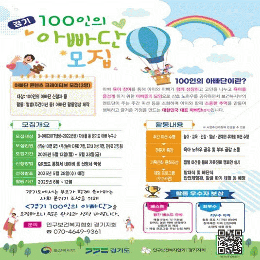 [NWS¹æ¼Û=Çѽ¸ñ ±âÀÚ]°æ±âµµ¿Í Àα¸º¸°Çº¹ÁöÇùȸ °æ±âµµÁöȸ´Â ³²¼º À°¾Æ Ȱ¼ºÈ­¸¦ À§ÇØ ¡®°æ±â 100ÀÎÀÇ ¾Æºü´Ü¡¯À» ¸ðÁýÇÑ´Ù°í 13ÀÏ ¹àÇû´Ù. µµ³» 3~9¼¼(2017~2022³â»ý) Àڳฦ µÐ À°¾Æ¿¡ °ü½ÉÀÖ´Â Ãʺ¸¾Æºü¶ó¸é ´©±¸³ª ½ÅûÀÌ °¡´ÉÇÏ¡¦