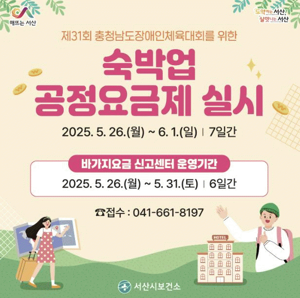 [NWS¹æ¼Û=Çѽ¸ñ ±âÀÚ]Ãæ³² ¼­»ê½Ã´Â Á¦31ȸ ÃæÃ»³²µµÀå¾ÖÀÎüÀ°´ëȸ ±â°£ ¼÷¹Ú¾÷¼Ò ¹Ù°¡Áö¿ä±Ý ±ÙÀýÀ» À§ÇØ 5¿ù 26ÀϺÎÅÍ 6¿ù 1ÀϱîÁö ¼÷¹Ú¾÷ °øÁ¤¿ä±ÝÁ¦¸¦ ¿î¿µÇÑ´Ù°í ¹àÇû´Ù. ½Ã´Â ´ëÇѼ÷¹Ú¾÷Áß¾Óȸ ¼­»ê½ÃÁöºÎ¿Í Çù¾÷À» ÅëÇØ °øÁ¤¿ä¡¦