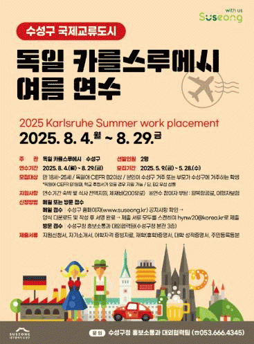 [NWS¹æ¼Û=Çѽ¸ñ ±âÀÚ]´ë±¸ ¼ö¼º±¸´Â 5¿ù 9ÀϺÎÅÍ 28ÀϱîÁö ¡®2025 µ¶ÀÏ Ä«¸¦½º·ç¿¡½Ã ¿©¸§¿¬¼ö(2025 Karlsruhe Summer work placement)¡¯¿¡ Âü°¡ÇÒ Áö¿ª Çлý 2¸íÀ» ¸ðÁýÇÑ´Ù. À̹ø ¿¬¼ö´Â µ¶ÀÏ Ä«¸¦½º·ç¿¡½Ã°¡ ¸Å³â ÁÖÃÖÇÏ´Â ±¹Á¦ ÀÎÅÏ¡¦
