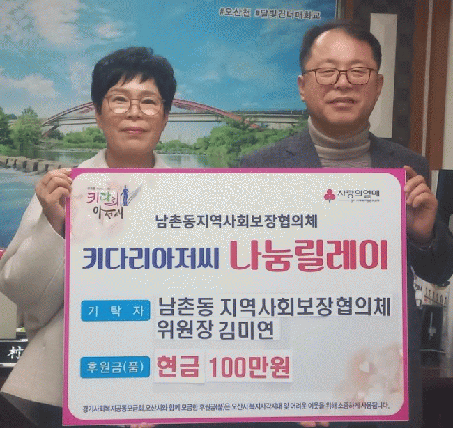[NWS¹æ¼Û=Çѽ¸ñ ±âÀÚ]¿À»ê½Ã ³²Ã̵¿ ÇàÁ¤º¹Áö¼¾ÅÍ´Â Áö³­ 9ÀÏ, Áö¿ª»çȸº¸ÀåÇùÀÇü ±è¹Ì¿¬ À§¿øÀåÀÌ °ü³» Àú¼ÒµæÃþ Áö¿øÀ» À§ÇØ ¼º±Ý 100¸¸ ¿øÀ» ±âŹÇß´Ù°í ¹àÇû´Ù. ±è¹Ì¿¬ À§¿øÀåÀº Áö¿ª»çȸº¸ÀåÇùÀÇü À§¿øÀ¸·Î Ȱµ¿ÇÏ¸ç º¹Áö »ç°¢Áö¡¦