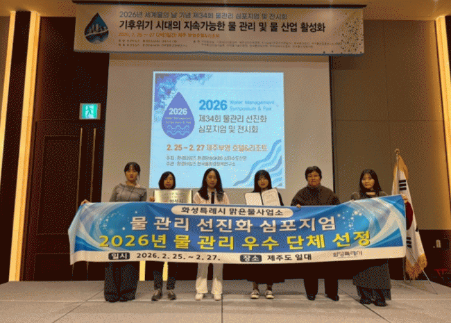 [NWS¹æ¼Û=Çѽ¸ñ ±âÀÚ]È­¼º½Ã ¸¼Àº¹°»ç¾÷¼Ò°¡ 25ÀÏ Á¦ÁÖµµ¿¡¼­ ¿­¸° 'Á¦34ȸ ¹° °ü¸® ¼±ÁøÈ­ ½ÉÆ÷Áö¾ö'¿¡¼­ ¡®2026 ¹° °ü¸® ÃÖ¿ì¼ö±â°ü¡¯À¸·Î ¼±Á¤µÆ´Ù°í ¹àÇû´Ù. ÃÖ¿ì¼ö±â°ü ¼±Á¤Àº ¿ì¼ö±â°ü Ãßõ ½ÅûÀ» ÅëÇØ ¼öµµ»ç¾÷ÀÚÀÇ ¿î¿µ ½ÇÀû°ú¡¦