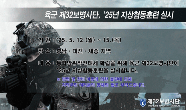 [NWS¹æ¼Û=Çѽ¸ñ ±âÀÚ]À°±º Á¦32º¸º´»ç´ÜÀº 12ÀϺÎÅÍ 15ÀÏ ¸ñ¿äÀϱîÁö Ãæ³²¤ý´ëÀü¤ý¼¼Á¾ Áö¿ª¿¡¼­ `25³â Áö»óÇùµ¿ÈÆ·ÃÀ» ½Ç½ÃÇÑ´Ù. À̹ø ÈÆ·ÃÀº ±¹Áöµµ¹ß Çٽɱ¹¸é¿¡ ´ëÇÑ ÀÛÀü°èȹÀ» ¼÷´Þ ¹× °ËÁõÇÏ´Â µ¥ ¸ñÇ¥¸¦ µÎ°í ÀÖÀ¸¸ç, À̸¦ À§ÇØ¡¦