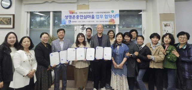 [NWS¹æ¼Û=Çѽ¸ñ ±âÀÚ]¼ö¿ø½Ã Àå¾È±¸ Á¤ÀÚ3µ¿°ú Á¤ÀÚ3µ¿ Áö¿ª»çȸº¸ÀåÇùÀÇü´Â Áö³­ 9ÀÏ, Á¤ÀÚ3µ¿ ÇàÁ¤º¹Áö¼¾ÅÍ¿¡¼­ ¼ö¿ø½Ã Àڻ쿹¹æ¼¾ÅÍ¿Í ÇÔ²² ¡®»ý¸íÁ¸Áß ¹®È­ È®»ê ¹× ÀÚ»ì ¿¹¹æÀ» À§ÇÑ ¾÷¹«Çù¾à¡¯À» ü°áÇß´Ù. À̳¯ Çù¾à½Ä¿¡´Â ÃÖȯ¡¦