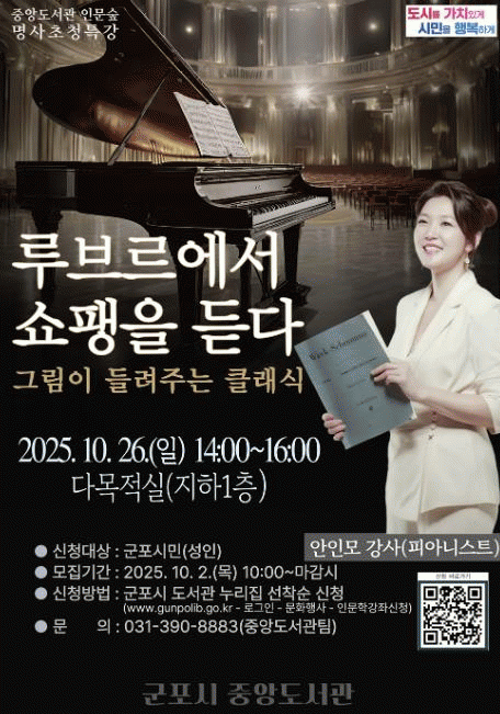 [NWS¹æ¼Û=Çѽ¸ñ ±âÀÚ]±ºÆ÷½Ã Áß¾Óµµ¼­°üÀÌ 2025³â ÇϹݱ⠡®Áß¾Óµµ¼­°ü Àι®½£¡¯ ¸í»ç ÃÊû Ư°­ÀÇ µÎ ¹øÂ° ¹«´ë¸¦ ¸¶·ÃÇÑ´Ù. ¿À´Â 10¿ù 26ÀÏ ¿ÀÈÄ 2½ÃºÎÅÍ 4½Ã±îÁö Áß¾Óµµ¼­°ü ÁöÇÏ 1Ãþ ´Ù¸ñÀû½Ç¿¡¼­ ÇǾƴϽºÆ®ÀÌÀÚ Å¬·¡½Ä ÇØ¼³°¡·Î¡¦