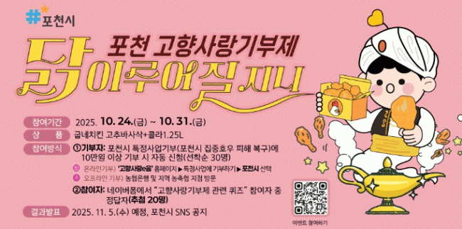 [»çȸ] Æ÷õ½Ã, ¡®°íÇâ»ç¶û±âºÎÁ¦ À̺¥Æ®¡¯ ÁøÇà±âºÎÇϰųª ÄûÁî Âü¿©Çϸé ġŲÀÌ ¡®´ß¡¯ ÀÌ·ç¾îÁú Áö´Ï~ |2025. 10.24