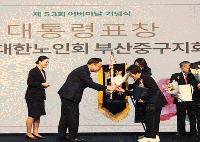 [NWS¹æ¼Û=Çѽ¸ñ ±âÀÚ]´ëÇѳëÀÎȸ ºÎ»êÁß±¸Áöȸ´Â Áö³­ 8ÀÏ ¹é¹ü ±è±¸±â³ä°ü¿¡¼­ °³ÃÖÇÑ Á¦53ȸ ¾î¹öÀ̳¯ ±â³ä½Ä¿¡¼­ °æ·ÎÈ¿Çà ½Çõ ÃÖ¿ì¼ö±â°ü ´ëÅë·É ǥâÀ» ¼ö»óÇß´Ù. ´ëÇѳëÀÎȸ ºÎ»êÁß±¸Áöȸ´Â 1997³âºÎÅÍ ÇöÀç±îÁö È¿½Çõ ÀåÇÐȸ¸¦¡¦
