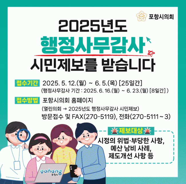 [NWS¹æ¼Û=Çѽ¸ñ ±âÀÚ]Æ÷Ç×½ÃÀÇȸ´Â 6¿ù 10ÀÏ °³È¸ ¿¹Á¤ÀÎ Á¦324ȸ Á¦1Â÷ Á¤·Êȸ ±â°£ Áß ½Ç½ÃµÇ´Â¡®2025³âµµ ÇàÁ¤»ç¹«°¨»ç¡¯¸¦ ¾ÕµÎ°í 12ÀϺÎÅÍ ´ÙÀ½ ´Þ 5ÀϱîÁö 25Àϰ£ ½Ã¹ÎÁ¦º¸¸¦ Á¢¼öÇÑ´Ù°í ¹àÇû´Ù. Á¦º¸ ´ë»óÀº ¡âÀ§¹ý.ºÎ´çÇÑ »çÇס¦