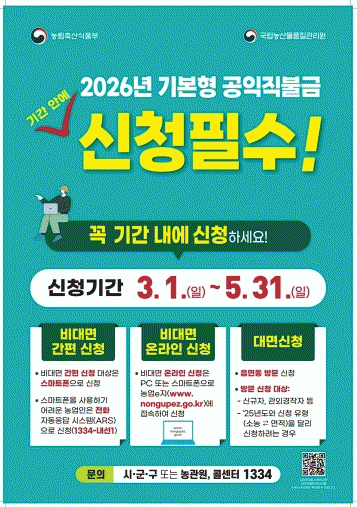 [NWS¹æ¼Û=Çѽ¸ñ ±âÀÚ]ÀÇÁ¤ºÎ½Ã´Â 3¿ùºÎÅÍ ¡®2026³â ±âº»Çü °øÀÍÁ÷ºÒ±Ý¡¯ ½ÅûÀ» Á¢¼öÇÑ´Ù°í 26ÀÏ ¹àÇû´Ù. ±âº»Çü °øÀÍÁ÷ºÒÁ¦´Â ³ó¾÷?³óÃÌÀÇ °øÀÍ ±â´É ÁõÁø°ú ³ó¾÷ÀÎ µîÀÇ ¼Òµæ ¾ÈÁ¤À» À§ÇØ ÀÏÁ¤ ÀÚ°ÝÀ» °®Ãß°í, Áؼö »çÇ×À» ÀÌÇàÇÑ ³ó¡¦
