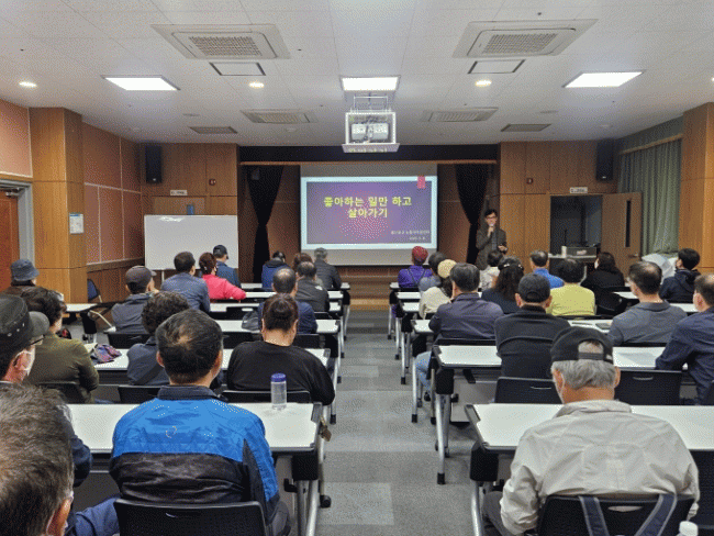 [NWS¹æ¼Û=Çѽ¸ñ ±âÀÚ]¿ï»ê µ¿±¸ ³ëµ¿ÀÚÁö¿ø¼¾ÅÍ´Â 5¿ù 8ÀÏ ¿ÀÀü 10½ÃºÎÅÍ 2½Ã°£ µ¿¾È ÅðÁ÷ÀÚ ¹× Áö¿ª ÁֹΠ50¿© ¸íÀÌ Âü°¡ÇÑ °¡¿îµ¥ ¡®ÁÁ¾ÆÇÏ´Â Àϸ¸ ÇÏ°í »ì¾Æ°¡±â¡¯¶ó´Â ÁÖÁ¦·Î Ư°­À» Çß´Ù. À̹ø Ư°­Àº ÅðÁ÷ ÈÄ Àλý ÈĹݿ¡´Â Àڽš¦