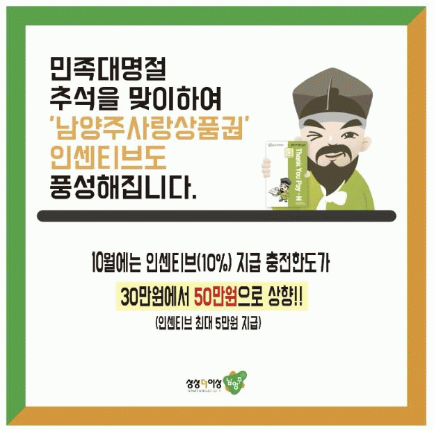 [NWS¹æ¼Û=Çѽ¸ñ ±âÀÚ]³²¾çÁֽô Ãß¼®À» ¸Â¾Æ À§ÃàµÈ ¼Òºñ½É¸® ȸº¹°ú Áö¿ª ³» ¼Òºñ ÃËÁøÀ» À§ÇØ 10¿ù ÇÑ ´Þ°£ ³²¾çÁÖ»ç¶û»óǰ±Ç Àμ¾Æ¼ºê ÃæÀü Çѵµ¸¦ ±âÁ¸ ¿ù 30¸¸ ¿ø¿¡¼­ 50¸¸ ¿øÀ¸·Î »óÇâÇÑ´Ù°í 25ÀÏ ¹àÇû´Ù. À̹ø Á¶Ä¡·Î ½Ã¹ÎÀº ÃÖ¡¦