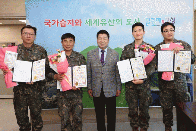 [NWS¹æ¼Û=Çѽ¸ñ ±âÀÚ]°í¼º±ºÀº 5¿ù 8ÀÏ ±º¼ö½Ç¿¡¼­ ¡®Á¦57Áֳ⠿¹ºñ±ºÀÇ ³¯¡¯À» ¸Â¾Æ Áö¿ª ¾Èº¸¿¡ ±â¿©ÇÑ ¿¹ºñ±º À¯°øÀÚ 4¸í¿¡°Ô ǥâÀ» ¼ö¿©Çß´Ù. À̳¯ Çà»ç´Â Áö¿ª ¿¹ºñ±º Á¶Á÷ÀÇ È°¼ºÈ­¿Í ÅëÇÕ¹æÀ§ ¾÷¹«¿¡ ±â¿©ÇÑ °ø·Î¿¡ °¨»çÀÇ ¶æÀ»¡¦