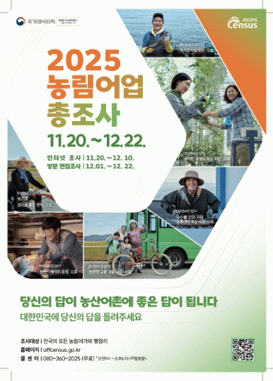 [NWS¹æ¼Û=Çѽ¸ñ ±âÀÚ]³²¾çÁֽô 11¿ù 20ÀϺÎÅÍ 12¿ù 22ÀϱîÁö ³ó¸²¾î°¡ 15,364°¡±¸¿Í ÇàÁ¤¸® 395°³ Àü Áö¿ªÀ» ´ë»óÀ¸·Î ¡®2025 ³ó¸²¾î¾÷ÃÑÁ¶»ç¡¯¸¦ ½Ç½ÃÇÑ´Ù°í ¹àÇû´Ù. ³ó¸²¾î¾÷ÃÑÁ¶»ç´Â 5³â ÁÖ±â·Î ½ÃÇàµÇ´Â ±¹°¡µ¥ÀÌÅÍó ÁÖ°ü Åë°èÁ¶¡¦