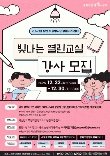 [»çȸ] ±¤¸í½Ã ÀλýÇ÷¯½º¼¾ÅÍ, ½ÅÁ߳⠾Ƹ¶Ãß¾î °­»ç ¸ðÁý¡¦¡®2026³â »ó¹Ý±â ºû³ª´Â ¿­¸°±³½Ç¡¯ ¿î¿µ |2025. 12.22