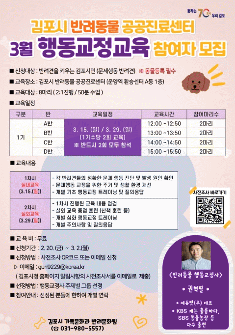 [NWS¹æ¼Û=Çѽ¸ñ ±âÀÚ]±èÆ÷½Ã´Â ¹Ý·Áµ¿¹° °ø°øÁø·á¼¾ÅÍ ¿¬°è ÇÁ·Î±×·¥ÀÎ ¡®¹Ý·Á°ß Çൿ±³Á¤±³À°¡¯ Á¦1±â Âü¿©ÀÚ¸¦ ¸ðÁýÇÑ´Ù°í ¹àÇû´Ù. ÇØ´ç ±³À°Àº ¹Ý·Á°ßÀÇ ¹®Á¦ÇൿÀ» °³¼±Çϰí ÀÌ¿ô°ú »ó»ýÇÏ´Â °Ç°­ÇÑ ¹Ý·Á¹®È­¸¦ Á¶¼ºÇϱâ À§ÇØ Áö³­¡¦