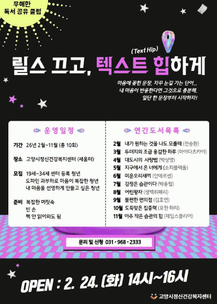 [NWS¹æ¼Û=Çѽ¸ñ ±âÀÚ]°í¾ç½ÃÁ¤½Å°Ç°­º¹Áö¼¾ÅÍ´Â ¸¸19~34¼¼ µî·Ïû³âÀ» ´ë»óÀ¸·Î ¡®¹«ÇØÇÑ µ¶¼­ °øÀ¯ Ŭ·´¡¯(¸±½º ²ô°í, ÅØ½ºÆ® ÈüÇϰÔ)À» ¸Å´Þ ¿î¿µÇÑ´Ù. ¡®¹«ÇØÇÑ µ¶¼­ °øÀ¯ Ŭ·´¡¯Àº ÃÖ±Ù ÀþÀºÃþ »çÀÌ¿¡¼­ µ¶¼­¸¦ ¸ÚÁø ¹®È­·Î ÇâÀ¯ÇÏ¡¦