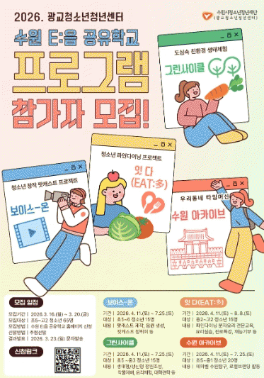 [NWS¹æ¼Û=Çѽ¸ñ ±âÀÚ]¼ö¿ø½Ãû¼Ò³âû³âÀç´Ü ±¤±³Ã»¼Ò³âû³â¼¾Åʹ û¼Ò³â ¸ÂÃãÇü ±³À°À» Á¦°øÇÏ´Â ¡®¼ö¿ø E:À½ °øÀ¯Çб³¡¯ ÇÁ·Î±×·¥ Âü°¡ÀÚ¸¦ ¿À´Â 2026³â 3¿ù 16ÀϺÎÅÍ 20ÀϱîÁö 5Àϰ£ ¸ðÁýÇÑ´Ù°í ¹àÇû´Ù. ¡®¼ö¿ø E:À½ °øÀ¯Çб³¡¯´Â ÇС¦