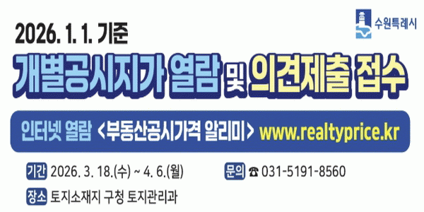 [»çȸ] ¼ö¿ø½Ã ¿µÅ뱸, 2026³â °³º°°ø½ÃÁö°¡ ¿­¶÷¡¤ÀǰßÁ¦Ãâ Á¢¼ö |2026. 03.19