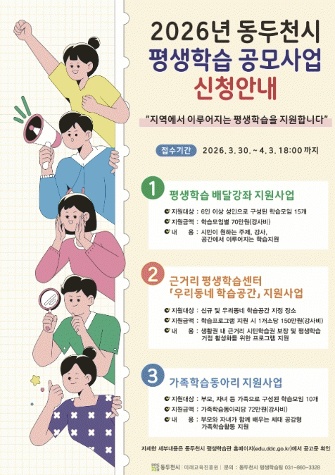 [NWS¹æ¼Û=Çѽ¸ñ ±âÀÚ]µ¿µÎõ½Ã´Â ½Ã¹ÎµéÀÇ ÀÚ¹ßÀûÀÎ ÇнÀ ¹®È­¸¦ È®»êÇϰí Áö¿ª Æò»ýÇнÀ °øµ¿Ã¼¸¦ Ȱ¼ºÈ­Çϱâ À§ÇØ ¡®2026³â Æò»ýÇнÀ °ø¸ð»ç¾÷¡¯ ½ÅûÀ» ¿À´Â 3¿ù 30ÀϺÎÅÍ 4¿ù 3ÀϱîÁö Á¢¼öÇÑ´Ù°í ¹àÇû´Ù. À̹ø °ø¸ð»ç¾÷Àº ÃÑ 3°³ ºÐ¡¦