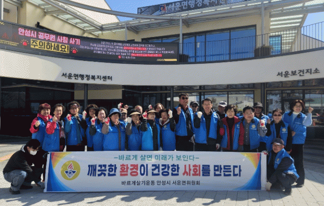 [NWS¹æ¼Û=Çѽ¸ñ ±âÀÚ]¾È¼º½Ã ¼­¿î¸é ¹Ù¸£°Ô»ì±âÀ§¿øÈ¸´Â Áö³­ 7ÀÏ, ȸ¿ø 30¿© ¸íÀÌ Âü¿©ÇÑ °¡¿îµ¥ ÄèÀûÇÑ ¸¶À» ȯ°æ Á¶¼ºÀ» À§ÇÑ »õº½¸ÂÀÌ ´ëû¼Ò¿¡ ³ª¼¹´Ù. À̹ø ȯ°æ Á¤È­ Ȱµ¿Àº ±¹Áöµµ 23È£¼± ÀÏ´ëÀÇ ¾²·¹±â »ó½À Åõ±â Áö¿ªÀ» Á߽ɡ¦