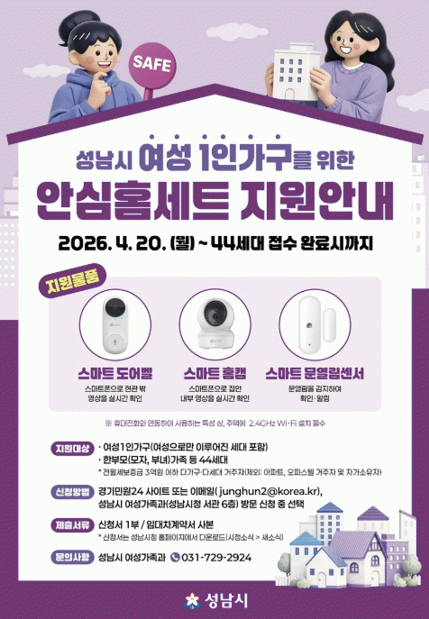 [»çȸ] ¼º³²½Ã, ¿©¼º 1ÀÎ °¡±¸ ¾È½É Ȩ¼¼Æ® 3Á¾ Áö¿ø |2026. 04.16