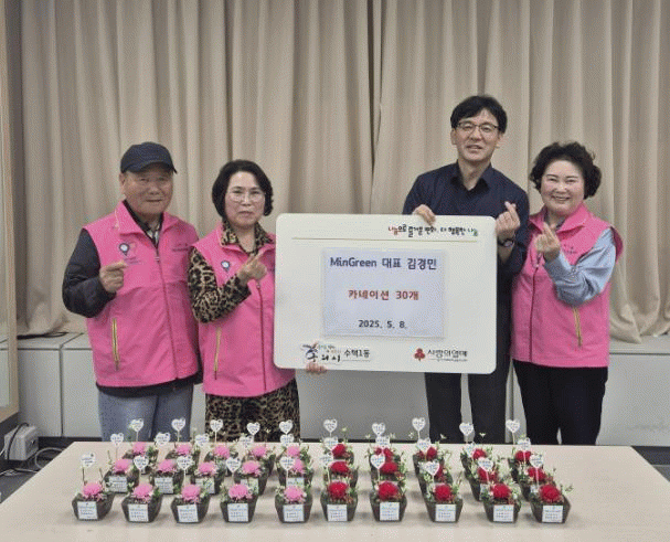 [NWS¹æ¼Û=Çѽ¸ñ ±âÀÚ]±¸¸®½Ã ¼öÅÃ1µ¿ÇàÁ¤º¹Áö¼¾ÅÍ´Â 5¿ù 8ÀÏ ±è°æ¹Î ¡®Min Green¡¯ ´ëÇ¥ÀÇ Àç´É±âºÎ·Î »ç¶ûÀÇ Ä«³×ÀÌ¼Ç È­ºÐ 30°³¸¦ ±âŹ¹Þ¾Ò´Ù. ÈÄ¿ø¹ÞÀº Ä«³×ÀÌ¼Ç È­ºÐÀº ¾î¹öÀ̳¯À» ¸ÂÀÌÇÏ¿© Ȧ·Î »ýȰÇϽô Áö¿ª ³» Ȧ·Î ¾î¸£½Å °¡¡¦