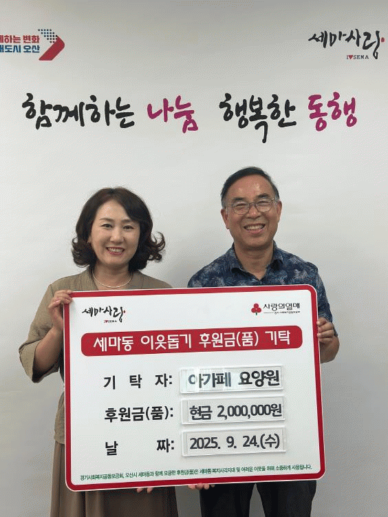 [»çȸ] ¿À»ê½Ã ¼¼¸¶µ¿, ¾Æ°¡Æä ¿ä¾ç¿ø¿¡¼­ Ãë¾à°èÃþ À§ÇÑ ¼º±Ý 2¹é¸¸ ¿ø ±âŹ |2025. 09.25