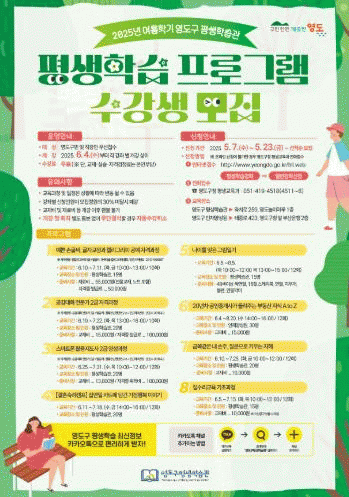[NWS¹æ¼Û=Çѽ¸ñ ±âÀÚ] ºÎ»ê½Ã ¿µµµ±¸´Â ±¸¹ÎµéÀÇ ÀÚ±â°è¹ß°ú Æò»ýÇнÀ ±âȸ¸¦ È®´ëÇϱâ À§ÇØ 2025³â ¿©¸§ÇÐ±â Æò»ýÇнÀ°ü ÇÁ·Î±×·¥ ¼ö°­»ýÀ» ¸ðÁýÇÑ´Ù. ¼ö°­´ë»óÀº ¿µµµ±¸¹Î ¶Ç´Â Áö¿ª ³» Á÷ÀåÀÎÀ̸ç, Á¢¼ö ±â°£Àº 5¿ù 7ÀϺÎÅÍ 5¿ù 23ÀÏ¡¦
