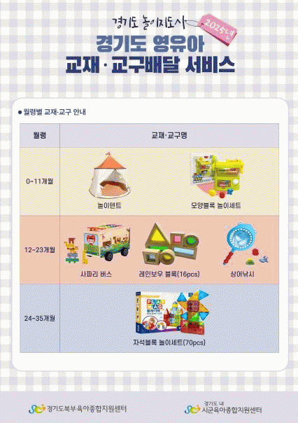 [NWS¹æ¼Û=Çѽ¸ñ ±âÀÚ]°æ±âµµ°¡ ¿µÀ¯¾Æ ¹ß´Þ´Ü°è¿¡ ÀûÇÕÇÑ ¸ÂÃãÇü ±³À硤±³±¸¸¦ °¡Á¤¿¡ ¹è´ÞÇÏ°í ³îÀÌÁöµµ¸¦ ÇÔ²² Áö¿øÇÏ´Â ¡®¿µÀ¯¾Æ ±³À硤±³±¸ ¹è´Þ¼­ºñ½º¡¯¸¦ ´ëÆø È®´ëÇÑ´Ù. µµ´Â Áö³­ÇØ 11¿ù 0~24°³¿ù, 25~47°³¿ù Àڳฦ µÐ 4,440°¡¡¦