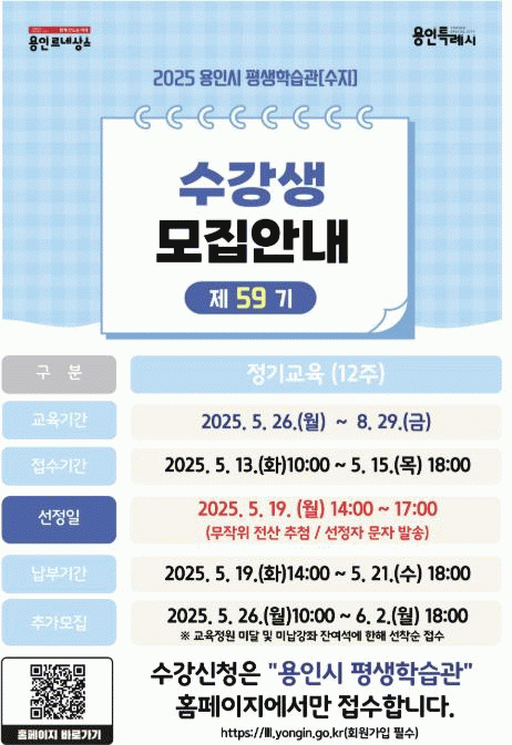 [»çȸ] ¿ëÀÎÆ¯·Ê½Ã, Æò»ýÇнÀ°ü(¼öÁö) 'Á¦59±â Á¤±â±³À°' ¼ö°­»ý ¸ðÁý |2025. 05.08