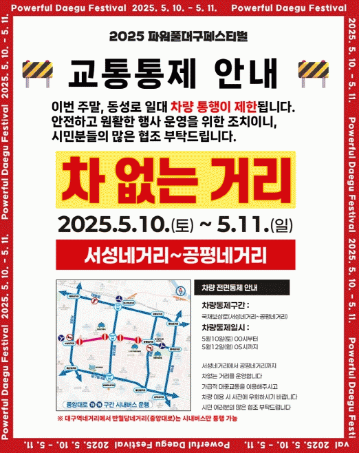 [NWS¹æ¼Û=ÇãÀº¼­ ±âÀÚ] ´ë±¸±¤¿ª½Ã´Â 2025ÆÄ¿öÇ®´ë±¸Æä½ºÆ¼¹úÀÌ °³ÃֵǴ 5¿ù 10ÀÏ 0½ÃºÎÅÍ 5¿ù 12ÀÏ ¿ÀÀü 5½Ã±îÁö ±¹Ã¤º¸»ó·Î(¼­¼º³×°Å¸® ~ °øÆò³×°Å¸®)¸¦ ±³ÅëÅëÁ¦ÇØ Â÷ ¾ø´Â °Å¸®·Î ¿î¿µÇÑ´Ù. ´ë±¸½Ã´Â ÃàÁ¦ÀÇ ¼º°øÀûÀÎ °³ÃÖ¿Í ±³ÅëÅ롦