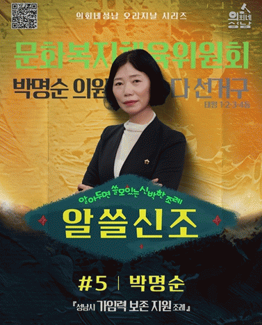 [NWS¹æ¼Û=Çѽ¸ñ ±âÀÚ]¼º³²½ÃÀÇȸ´Â ¡®¾Ë¾µ½ÅÁ¶-¹Ú¸í¼ø ÀÇ¿ø Æí¡¯ ¿µ»óÀ» 7ÀÏ 17½Ã ½ÃÀÇȸ °ø½Ä SNS¿¡ °Ô½ÃÇÑ´Ù. À̹ø¿¡ ¼Ò°³µÉ Á¶·Ê´Â ¹Ú¸í¼ø ÀÇ¿ø µî 7¸íÀÌ ¹ßÀÇÇÑ ¡®¼º³²½Ã °¡ÀÓ·Â º¸Á¸ Áö¿ø Á¶·Ê¡¯ÀÌ´Ù. ÀÌ Á¶·Ê´Â °¡ÀÓ·ÂÀ» º¸Á¸ÇÏ¡¦