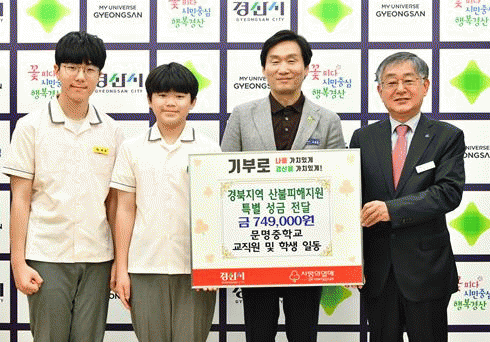 [NWS¹æ¼Û=Çѽ¸ñ ±âÀÚ]¹®¸íÁßÇб³´Â 2ÀÏ °æ»ê½ÃûÀ» ¹æ¹®ÇÏ¿© ÃÖ±Ù ¹ß»ýÇÑ »êºÒ·Î ÇÇÇØ¸¦ ÀÔÀº Áö¿ª ÁֹεéÀ» À§ÇØ ±³Á÷¿ø°ú ÇлýµéÀÌ ÇÔ²² ÈûÀ» ¸ð¾Æ ¼º±Ý 74¸¸9õ¿øÀ» ±âŹÇß´Ù. Ã־缷 ±³ÀåÀº¡°±³Á÷¿ø, ÇлýµéÀÌ ÇÔ²² ¸ðÀº ¼º±ÝÀÌ ºñ¡¦