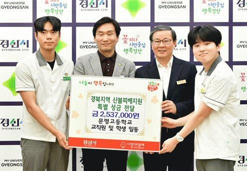 [NWS¹æ¼Û=Çѽ¸ñ ±âÀÚ]¹®¸í°íµîÇб³´Â 2ÀÏ °æ»ê½ÃûÀ» ¹æ¹®ÇÏ¿© ÃÖ±Ù »êºÒ·Î Å« ÇÇÇØ¸¦ ÀÔÀº Áö¿ª Áֹε鿡°Ô µµ¿òÀ» ÁÖ°íÀÚ ±³Á÷¿ø°ú ÇлýµéÀÌ ÇѸ¶À½ ÇѶæÀ¸·Î ¸ðÀº ¼º±Ý 253¸¸7õ¿øÀ» ±âŹÇß´Ù. ÀÓÁØÈñ ±³ÀåÀº¡°ÇлýµéÀÌ ³ª´®ÀÇ °¡Ä¡¡¦