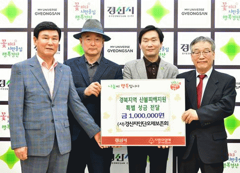 [NWS¹æ¼Û=Çѽ¸ñ ±âÀÚ](»ç)°æ»êÀÚÀδܿÀÁ¦º¸Á¸È¸´Â 2ÀÏ °æ»ê½ÃûÀ» ¹æ¹®ÇÏ¿© ÃÖ±Ù ¹ß»ýÇÑ »êºÒ·Î Å« ÇÇÇØ¸¦ ÀÔÀº ÀÌÀç¹ÎµéÀ» µ½±â À§ÇØ ¼º±Ý 100¸¸¿øÀ» ±âŹÇß´Ù. ÃÖÁ¾±Ô ȸÀåÀº¡°°©ÀÛ½º·¯¿î »êºÒ·Î »îÀÇ ÅÍÀüÀ» ÀÒÀº ÀÌ¿ôµéÀ» »ý°¢ÇÏ´Ï¡¦