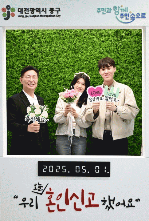 [NWS¹æ¼Û=Çѽ¸ñ ±âÀÚ] ´ëÀü Áß±¸´Â È¥ÀÎ½Å°í¸¦ ¸¶Ä£ ½ÅÈ¥ºÎºÎµéÀÌ Æ¯º°ÇÑ ¼ø°£À» ±â³äÇÒ ¼ö ÀÖµµ·Ï, Áß±¸Ã» 1Ãþ Á¾Çչοø½Ç ³»¿¡ ¡®È¥ÀÎ½Å°í ±â³ä Æ÷ÅäÁ¸¡¯À» ¼³Ä¡Çß´Ù°í 7ÀÏ ¹àÇû´Ù. À̹ø¿¡ Á¶¼ºµÈ Æ÷ÅäÁ¸Àº ¡°¿ì¸® ¿À´Ã È¥ÀνŰíÇ߾