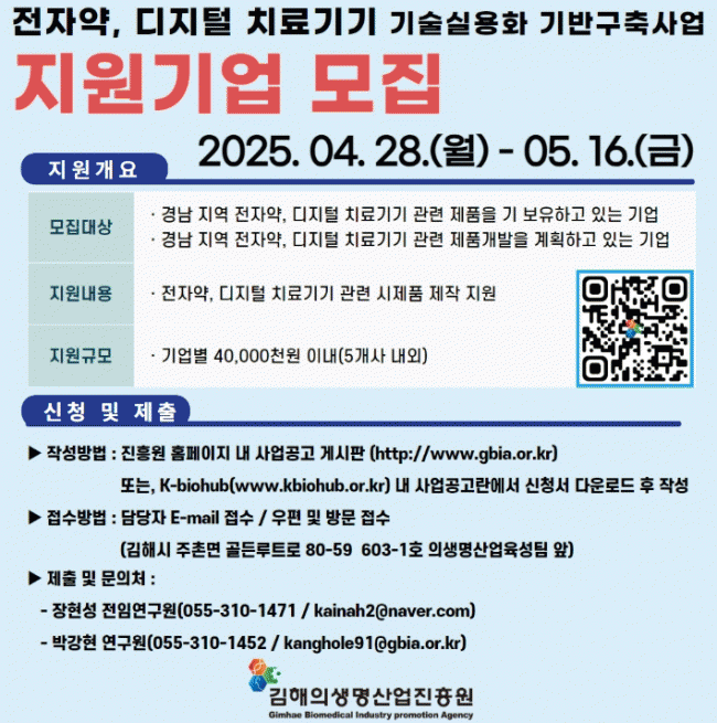 [NWS¹æ¼Û=ÇãÀº¼­ ±âÀÚ]±èÇØÀÇ»ý¸í»ê¾÷ÁøÈï¿øÀº »ê¾÷Åë»óÀÚ¿øºÎ°¡ ÁÖ°üÇÏ´Â '2025³â ÀüÀھࡤµðÁöÅÐÄ¡·á±â±â ±â¼ú ½Ç¿ëÈ­ ±â¹Ý±¸Ãà»ç¾÷'ÀÇ ¼öÇý±â¾÷À» Áö³­ 28ÀϺÎÅÍ ¸ðÁýÇϰí ÀÖ´Ù°í ¹àÇû´Ù. ÀüÀÚ¾à°ú µðÁöÅÐ Ä¡·á±â±â´Â ¾à¹°À̳ª ½Ã¼ú¡¦