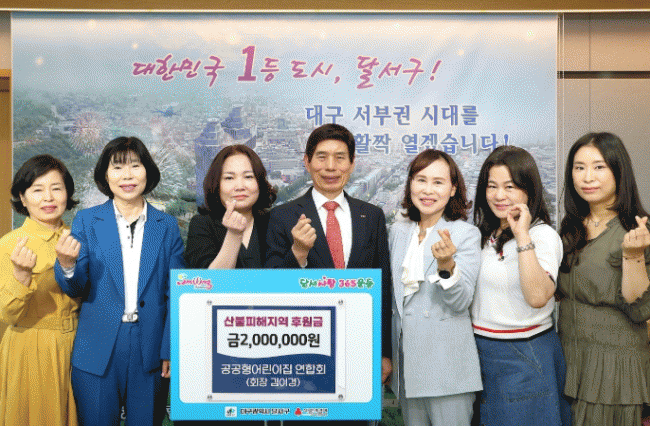 [NWS¹æ¼Û=Çѽ¸ñ ±âÀÚ]´ë±¸ ´Þ¼­±¸´Â °ø°øÇü¾î¸°ÀÌÁý ¿¬ÇÕȸ·ÎºÎÅÍ »êºÒ ÇÇÇØÁö¿ª Áö¿øÀ» À§ÇÑ ÈÄ¿ø±Ý 200¸¸ ¿øÀ» ±âŹ¹Þ¾Ò´Ù°í 7ÀÏ ¹àÇû´Ù. ±èÀ̰æ ȸÀåÀº ¡°»êºÒ ÇÇÇØ·Î »îÀÇ ÅÍÀüÀ» ÀÒÀº ÀÌ¿ôµéÀ» »ý°¢ÇÏ¸ç ¿¬ÇÕȸ¿¡¼­ ÀÛÀº Á¤¼ºÀ»¡¦