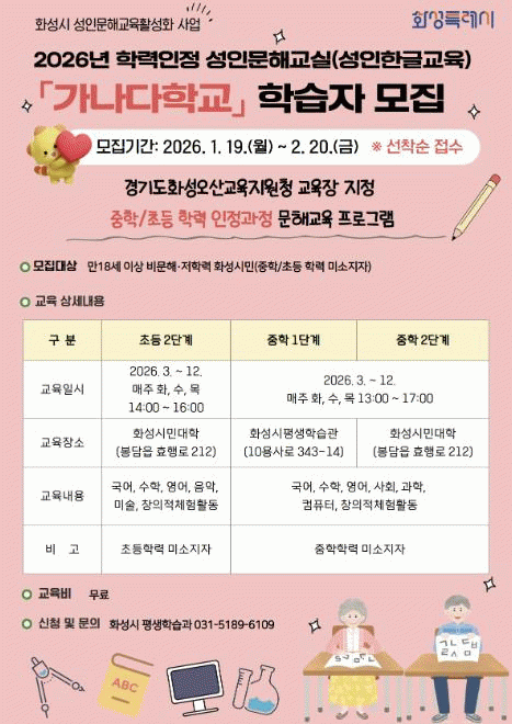 [NWS¹æ¼Û=Çѽ¸ñ ±âÀÚ]È­¼ºÆ¯·Ê½Ã´Â 19ÀϺÎÅÍ 2¿ù 20ÀϱîÁö 2026³â ¼ºÀÎÀ» À§ÇÑ Çѱ۱³½Ç ¡®°¡³ª´ÙÇб³¡¯ ¹× ¡®´Ã¹è¿òÇб³¡¯ ¼ö°­»ýÀ» ¼±Âø¼ø ¸ðÁýÇÑ´Ù°í 19ÀÏ ¹àÇû´Ù. °¡³ª´ÙÇб³´Â ÇзÂÀÎÁ¤ ¹®Çر³À° ÇÁ·Î±×·¥À¸·Î, Ãʵî 2´Ü°è¿Í ÁßÇС¦