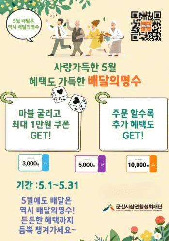 [NWS¹æ¼Û=ÇãÀº¼­ ±âÀÚ]±º»ê½Ã °ø°ø ¹è´Þ¾Û ¡®¹è´ÞÀÇ ¸í¼ö¡¯°¡ 5¿ù °¡Á¤ÀÇ ´ÞÀ» ¸Â¾Æ Áö¿ª ¼Ò»ó°øÀÎÀ» ÀÀ¿øÇÏ°í ½Ã¹Îµé¿¡°Ô ´Ù¾çÇÑ ÇýÅÃÀ» Á¦°øÇϴ Ưº°À̺¥Æ®¸¦ ÁøÇàÇÑ´Ù. ¿À´Â 31ÀϱîÁö ¡®¹è´ÞÀÇ ¸í¼ö¡¯ ¾ÛÀ» ÅëÇØ ÁÖ¹®Çϸé ÁÖ»çÀ§¸¦ ¡¦