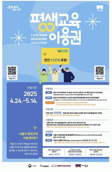 [NWS¹æ¼Û=Çѽ¸ñ ±âÀÚ]Á¾·Î±¸°¡ 5¿ù 14ÀϱîÁö ¡®2025³â Æò»ý±³À°ÀÌ¿ë±ÇÁö¿ø»ç¾÷¡¯ ½ÅûÀ» Á¢¼öÇÑ´Ù. ¹è¿ò¿¡ ¸ñ¸¶¸¥ ±¸¹ÎµéÀ» À§ÇØ ±¸¿¡¼­ ÀÚ°ÝÁõºÎÅÍ ¾îÇÐ, â¾÷, Àι®ÇÐ µî ´Ù¾çÇÑ Æò»ý±³À° °­ÁÂÀÇ ¼ö°­·á¿Í ±³Àçºñ·Î »ç¿ëÇÒ ¼ö ÀÖ´Â ¿¬¡¦