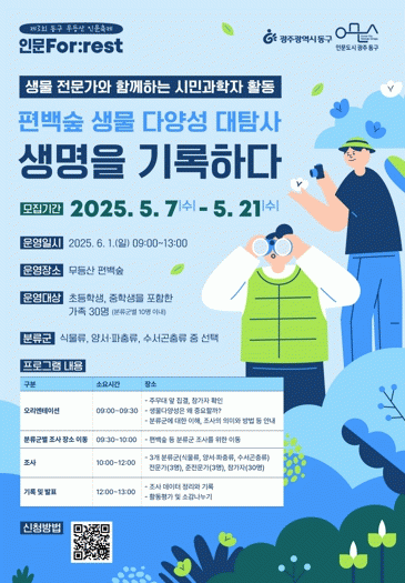 [NWS¹æ¼Û=Çѽ¸ñ ±âÀÚ]±¤ÁÖ µ¿±¸°¡ ÀÌ´Þ 31ÀϺÎÅÍ 6¿ù 1ÀϱîÁö ÀÌÆ²°£ ¿­¸®´Â ¡®Á¦3ȸ ¹«µî»ê Àι®ÃàÁ¦¡¯ 'Àι® For:rest'ÀÇ »çÀüÁ¢¼ö ÇÁ·Î±×·¥ Âü¿©ÀÚ¸¦ ¿À´Â 7ÀϺÎÅÍ ¸ðÁýÇÑ´Ù°í ¹àÇû´Ù. À̹ø¿¡ »çÀü ¸ðÁýÇÏ´Â ÇÁ·Î±×·¥Àº ¡ãÆí¹é½£ »ý¡¦