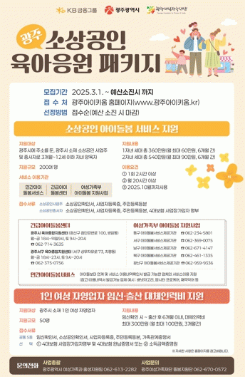 [NWS¹æ¼Û=Çѽ¸ñ ±âÀÚ]±¤Áֽð¡ Áö¿ª ¼Ò»ó°øÀεéÀÇ À°¾Æ ºÎ´ãÀ» ´ú¾îÁÖ°íÀÚ ½ÃÇà ÁßÀÎ ¡®±¤ÁÖ ¼Ò»ó°øÀÎ À°¾ÆÀÀ¿øÆÐŰÁö Áö¿ø»ç¾÷¡¯ÀÌ È£ÀÀÀ» ¾ò°í ÀÖ´Ù. ±¤ÁÖ±¤¿ª½Ã´Â KB±ÝÀ¶±×·ìÀÇ ÈÄ¿ø(»ç¾÷ºñ 10¾ï¿ø)À¸·Î 3°³¿ù~12¼¼ Àڳฦ µÐ Áö¿ª ¡¦